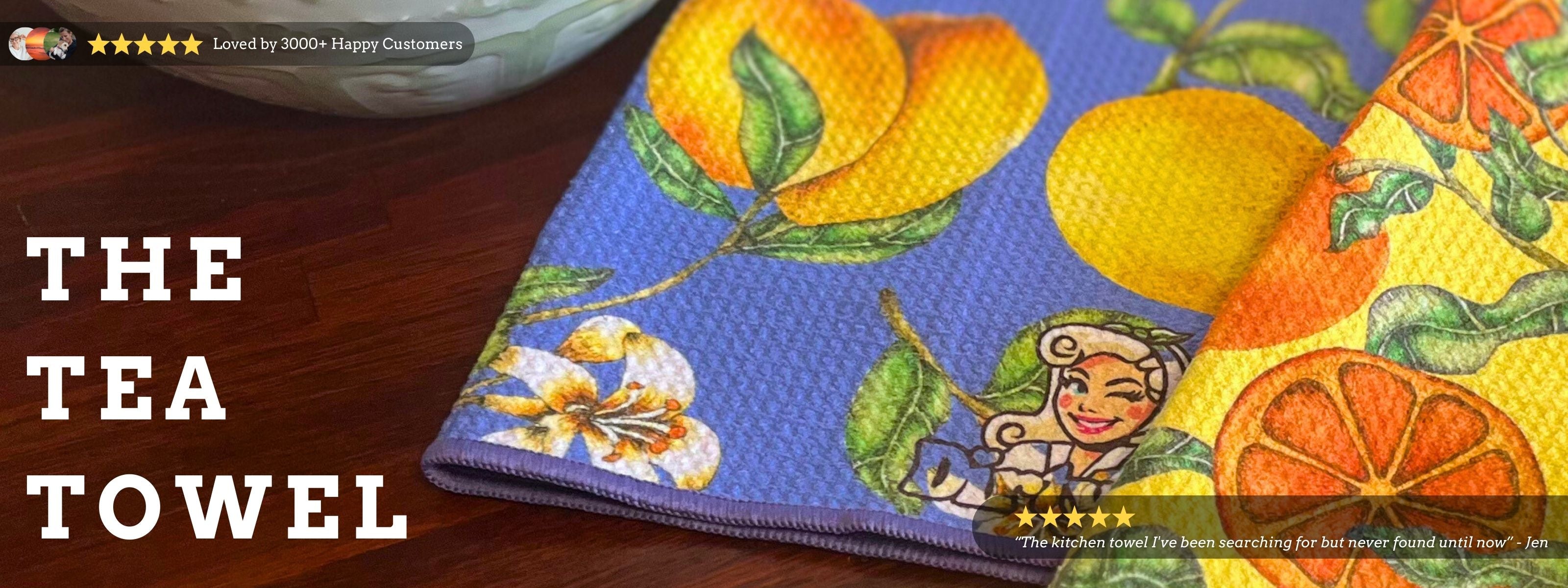 Premium DirtyGirl Tea Towel – Lemon Burst – main product image – Lint-free finishDirtyGirl Lemon Burst Tea Towel folded neatly over oven handle – Machine washable